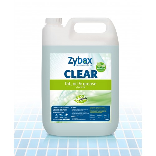 • Zybax Clear biologically breaks down fat and grease deposits quickly and safely by using bacteria and enzymes.