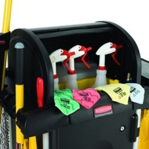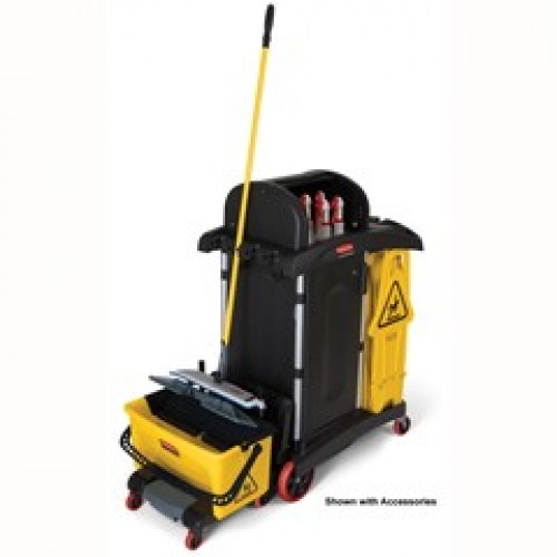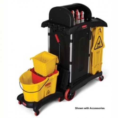 This black high-security cleaning cart w/ locking doors on both sides is the complete system solution for moving and using all your HYGEN microfiber cleaning products at once. It features 7.25 cubic feet of locking cabinet space plus 5 cubic feet of lower shelf space and 20% more waste capacity than the 6173 cleaning cart. The Lock 'N Go bucket attachment lets you securely fasten a HYGEN™ or WaveBrake® bucket to the end, while the rubber tool grips hold your mop handles upright for quick access. The cart itself has a non-rusting, easy to clean plastic and aluminum construction with a comfort grip handle and quiet 4" casters and 8" wheels. There is also space for holding lobby brooms, dust pans, vacuums and up to four safety signs.