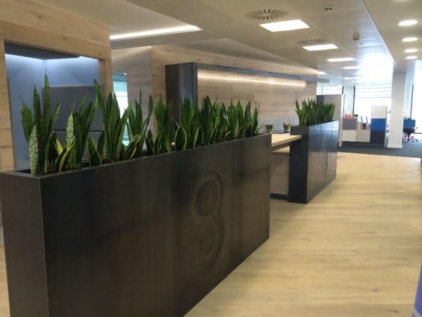 Using the stunning bespoke plant trays, we planted two types of Sansevieria plants that help to naturally screen and divide areas of the open plan office and break-out areas.