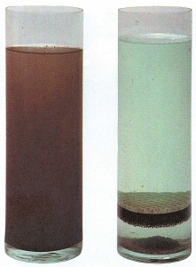 Here's an image comparing standard mop bucket water with a filter and grid system found in High-tower buckets;