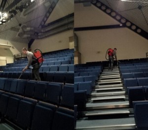 Ollie cleaning with Numatic back pack in auditorium Ollie cleaning with Numatic back pack in auditorium