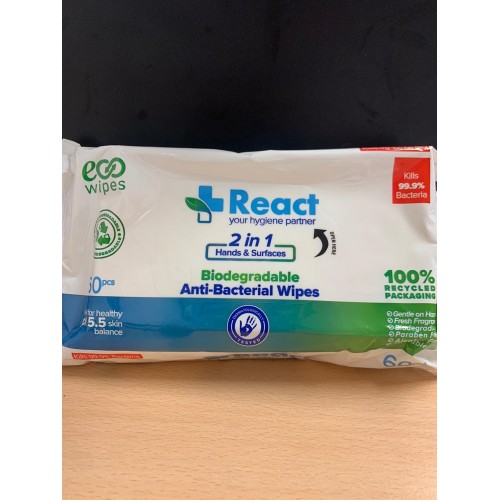 A pack of 60 anti bacterial wipes suitable for use on hands or surfaces.  A highly effective, alcohol-free formulation, these kill 99.9% of bacteria but are still kind to both skin and surfaces.  The wipes are both biodegradable and flushable.
